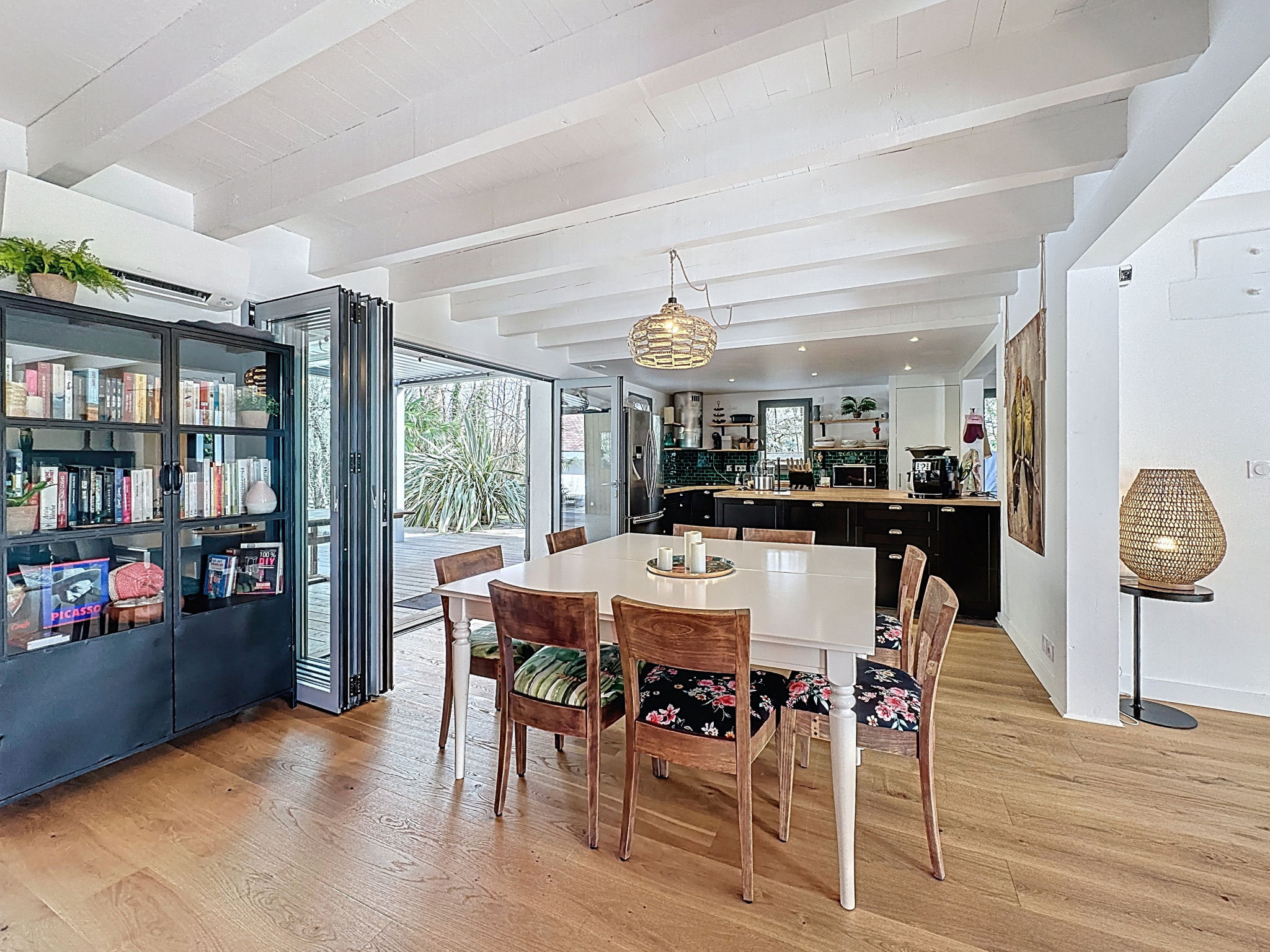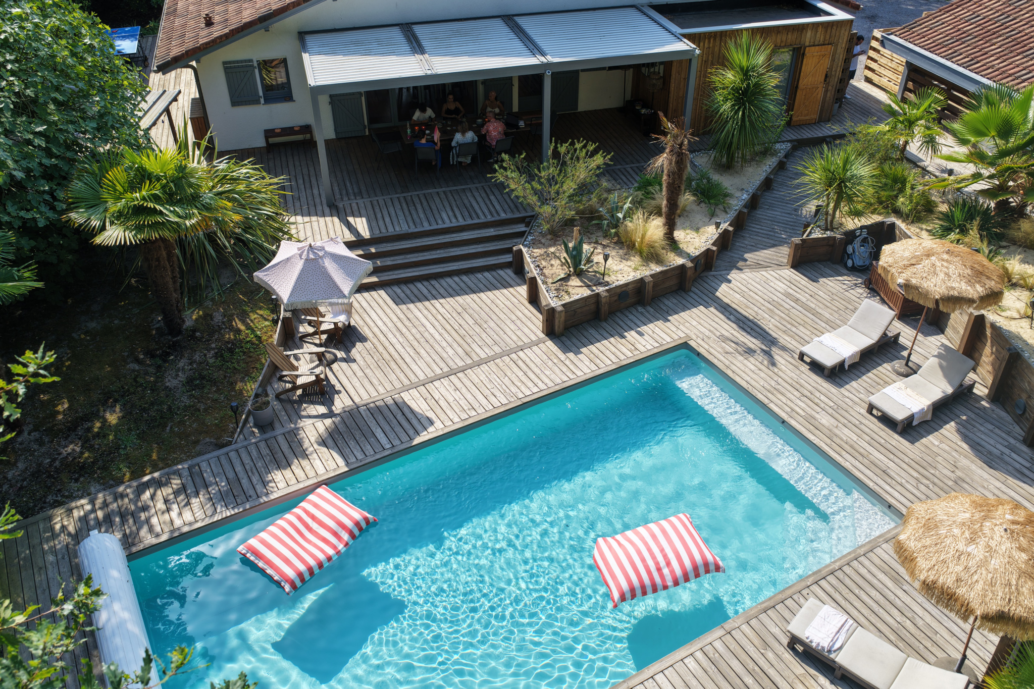 Au cœur d’un environnement préservé, entourée de chênes lièges, à l’abri des regards où le temps ralentit; cette propriété rénovée offre un cadre de vie rare, entre forêt landaise et océan. Dès l’arrivée, on ressent le calme, l’espace, et cette impression d’être ailleurs, tout en restant à quelques minutes des plages et des villages animés. Organisée autour de la piscine et de larges terrasses, la propriété invite à une vie tournée vers l’extérieur : déjeuners à l’ombre, longues soirées d’été, moments partagés en famille ou entre amis. La maison principale, baignée de lumière, s’ouvre généreusement sur le jardin et prolonge naturellement la vie dehors. Les espaces sont pensés pour être à la fois conviviaux et apaisants. Plusieurs lieux de vie viennent compléter l’ensemble, permettant d’accueillir, de recevoir… ou simplement de profiter autrement du domaine. Et puis, il y a ce détail que l’on découvre sur place, qui rend ce lieu encore plus singulier. Un bien à vivre, plus qu’à décrire — pour ceux qui recherchent la nature, la discrétion et un certain art de vivre entre pinède et océan.